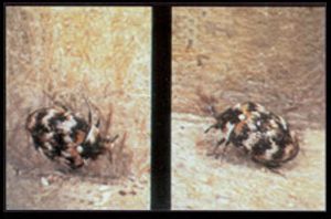 Adults small, somewhat flattened and oval in shape. Colors black, white, and brown, mottled and variable. Only larvae damage animal materials such as fur, skins, wool, felt, insects. Larva brown, very hairy, head end narrow, posterior widened with 3 tufts of long hairs. Commonly infest any man-made object of animal origin, insect and bird nests. Larval period normally lasts almost a year. Adults feed on flowers, larvae very active in wandering about.